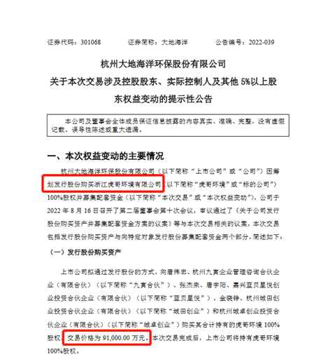 生活垃圾分類回收“藍(lán)?!闭絹碓蕉嘤袑?shí)力的公司競逐。8月17日,大地海洋(301068.SZ)披露重大資產(chǎn)重組草案,公司擬通過發(fā)行股份的方式,向唐偉忠、九寅合伙、張杰來、唐宇陽、藍(lán)貝星悅、金曉錚、城田創(chuàng)業(yè)和城卓創(chuàng)業(yè)購買其合計(jì)持有的虎哥環(huán)境100%股權(quán),交易價(jià)格為9.1億元;同時擬向合計(jì)不超過35...