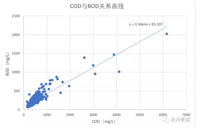 這個方程和我們數(shù)學計算的方程基本一致,因此可以知道數(shù)學方法和表格方法都是可以完成這個線性方程式的推算的。這個線性方程的得出,可以便捷的通過進水的COD來快捷的判斷進水的BOD值,不必要等到5天后出來BOD5再來判斷系統(tǒng)的碳源是否充足。