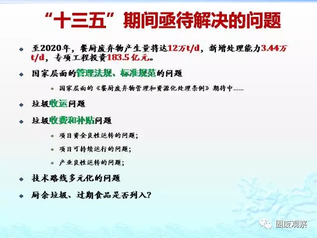 2017年1月下旬,國(guó)家發(fā)改委印發(fā)《戰(zhàn)略性新興產(chǎn)業(yè)重點(diǎn)產(chǎn)品和服務(wù)指導(dǎo)目錄》(2016版),將“餐廚廢棄物資源化無(wú)害化利用”的相關(guān)裝備和技術(shù)研發(fā),列入“資源循環(huán)利用產(chǎn)業(yè)”分項(xiàng)之一。將預(yù)示著“十三五”期間,餐廚垃圾市場(chǎng)又一次發(fā)展機(jī)遇。據(jù)任連海教授透露,國(guó)家層面的《餐廚廢棄物管理和資源化處理?xiàng)l例》已經(jīng)成文,餐廚垃圾處理市場(chǎng)運(yùn)營(yíng)機(jī)制也有望進(jìn)一步明朗。預(yù)計(jì)該條例的推出,對(duì)進(jìn)一步規(guī)范餐廚垃圾管理將起到至關(guān)重要的作用。在政策逐步完善的發(fā)展條件下,餐廚垃圾處理行業(yè)將迎來(lái)巨大發(fā)展空間,十三五期間,餐廚垃圾市場(chǎng)預(yù)計(jì)將達(dá)1500-2000億。