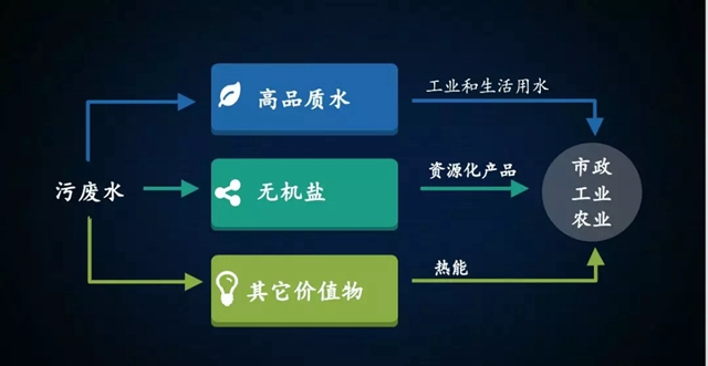 首先把污水里面的水提純?yōu)楦咂焚|(zhì)的再生水,回用于工業(yè)或者市政領(lǐng)域。產(chǎn)生的濃鹽水再次提純,產(chǎn)生有價值的工業(yè)產(chǎn)品、化工產(chǎn)品。同時,污水里還有其他有價值的東西,比方說熱能,也可以再次利用起來。