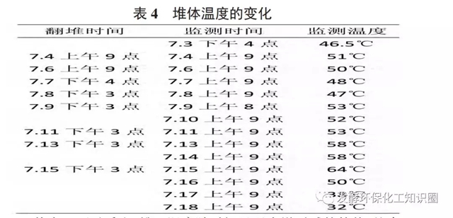 一般認(rèn)為高溫菌對有機(jī)物的降解效率高于中溫菌,但溫度過高,容易導(dǎo)致嗜熱菌的死亡,從而影響處理效果,高溫堆肥最高溫度一般控制在65℃以下。堆肥過程中堆體溫度變化見表4。