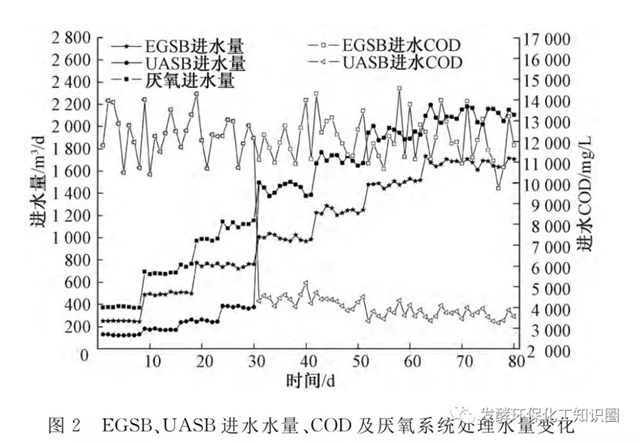EGSB及UASB采用同類檸檬酸生產(chǎn)廠家厭氧顆粒污泥啟動,EGSB和UASB投加的含水率94%的顆粒污泥量分別是600m3和300m3,占各自反應器容積的45%和30%。EGSB、UASB進水水量、COD及厭氧系統(tǒng)處理水量變化見圖2。