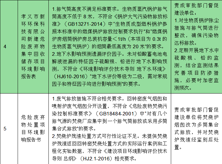 根據(jù)通報文件可知,21個項目中6個為危廢、固廢處理相關(guān)項目,占比28.57%。危廢、固廢相關(guān)環(huán)評項目本身就較為敏感,容易受到審批部門關(guān)注,因此將文件中危廢、固廢相關(guān)環(huán)評受到通報的問題復(fù)制粘貼如下所示: