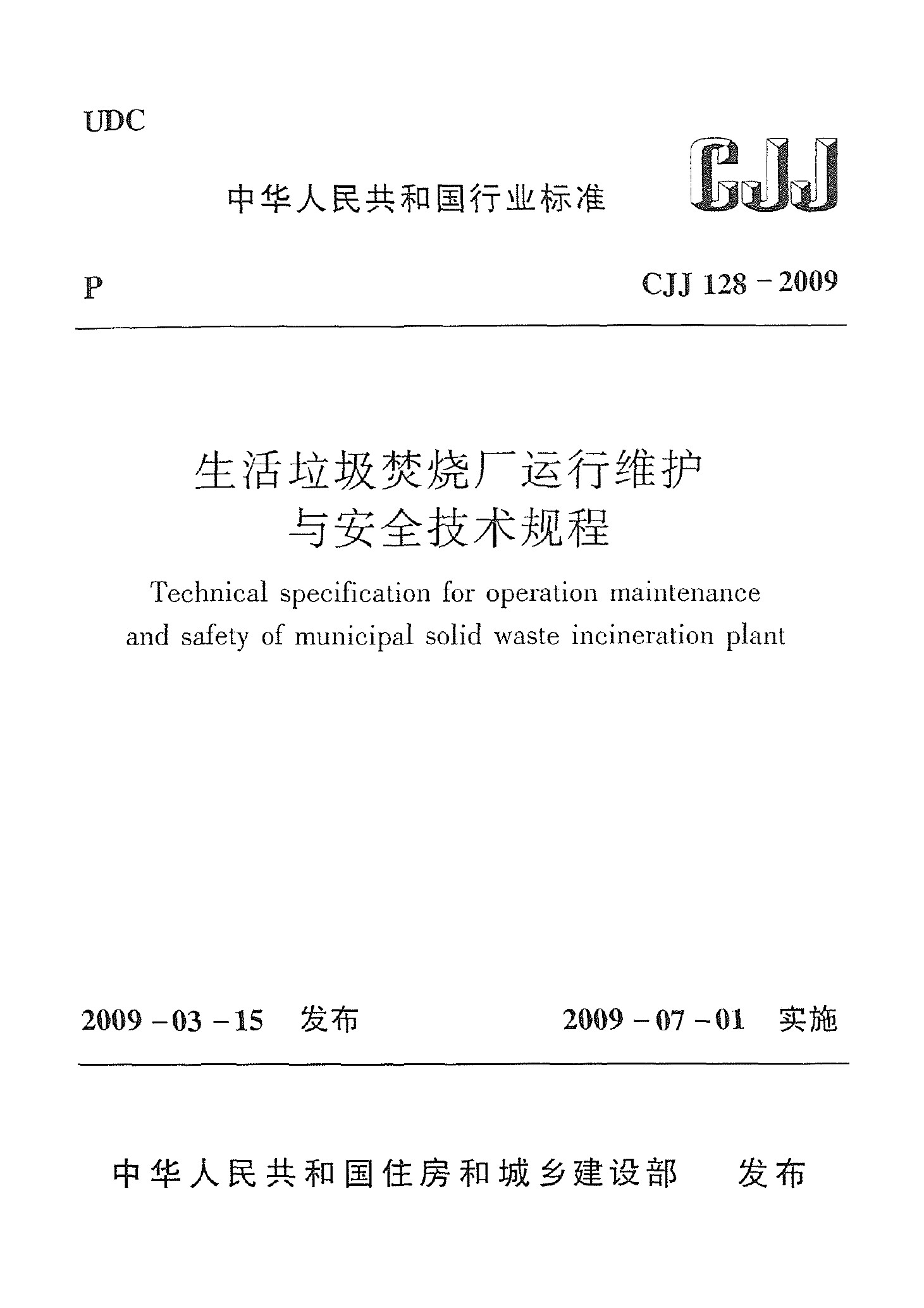 生活垃圾焚燒廠運(yùn)行維護(hù)與安全技術(shù)規(guī)程(CJJ 128-2009)
