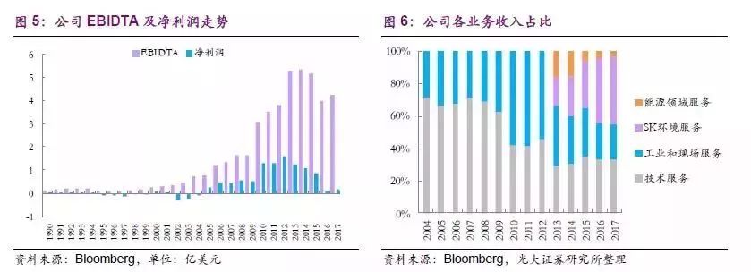 除傳統(tǒng)的技術(shù)服務(wù)之外,公司還提供SK環(huán)境及性能產(chǎn)品服務(wù)、工業(yè)和現(xiàn)場服務(wù)、以及能源領(lǐng)域(石油天然氣和住宿)服務(wù)三大業(yè)務(wù),努力向“一站式服務(wù)”的服務(wù)提供商靠攏。其中,前兩種業(yè)務(wù)和傳統(tǒng)的技術(shù)服務(wù)共同構(gòu)成了公司的核心增長動力,三者營業(yè)收入占比高達96%;而能源領(lǐng)域服務(wù)在未來有望隨著美國頁巖氣革命的發(fā)展給公司帶來新的增量。