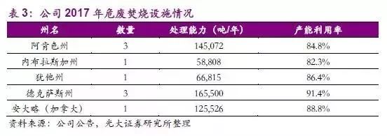 危廢焚燒方面,公司擁有北美共13個商業(yè)危險廢物焚化爐中的9個,是北美這類設(shè)施的最大運營商。公司垃圾焚燒實際處理能力為561,721噸,2017年的平均使用率為87.6%。