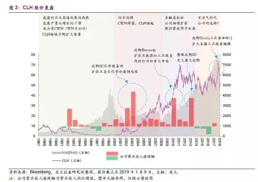 公司在成立后的近40年里,通過大大小小近40余次外延并購,在增加危險廢物處理設(shè)施的數(shù)量和覆蓋區(qū)域、擴大業(yè)務(wù)服務(wù)范圍的同時,也致力于增添新的涵蓋多個行業(yè)和業(yè)務(wù)類型的服務(wù)領(lǐng)域、擴大服務(wù)種類,最終從一家小型油罐清潔公司成長為北美領(lǐng)先的環(huán)境和工業(yè)服務(wù)提供商和最大的危險廢物處理公司。尤其是在美國危廢行業(yè)十年調(diào)整蕭條期的時候,通過一次次并購,公司不僅生存了下來,還改變了市場格局,逐漸成為行業(yè)龍頭。縱觀公司整個并購過程,可以大致分為三個階段。