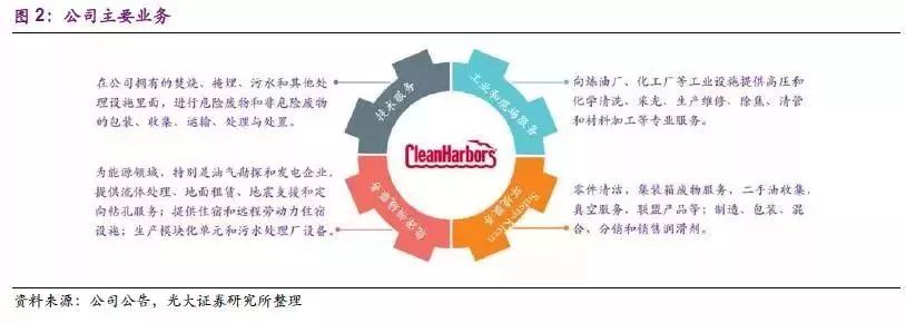 公司上在原有危廢處理技術(shù)的基礎(chǔ)上,通過兼并收購增添一系列新的服務(wù)領(lǐng)域。2008年,公司通過收購Safety-Kleen 溶劑回收部門和Universal 環(huán)境部門,開始涉足溶劑回收市場,新增大量業(yè)務(wù)。2009年,公司收購Eveready,在進軍加拿大市場的同時,擴大了公司能源和工業(yè)服務(wù)范圍。能源和工業(yè)部門為石油和天然氣勘探和生產(chǎn),煉油,石化,紙漿和造紙以及電力公用事業(yè)終端市場等提供一系列服務(wù)。此前,Clean Harbors 在這一領(lǐng)域的傳統(tǒng)業(yè)務(wù)相對較小,收購Eveready 將公司的能源和工業(yè)服務(wù)收入從3千萬增加到5.5~6億,使其從一個小眾玩家成長為了市場上該項業(yè)務(wù)強有力的競爭對手。2011年,公司收購 Peak Energy Services,提供固、液、污泥處理及地面租賃服務(wù),將業(yè)務(wù)擴大到石油和天然氣鉆井領(lǐng)域。2012年,公司收購北美領(lǐng)先的廢油回收和再精煉、零件清潔及環(huán)境解決方案公司Safety-Kleen,是公司歷史上最大規(guī)模收購。對Safety-Kleen的并購使得公司成為北美最大的二手油重磨機和回收商。此次收購新增了環(huán)境服務(wù)業(yè)務(wù),進一步鞏固了公司危廢處理行業(yè)的領(lǐng)導(dǎo)者地位。公司在2013年和2015年相繼收購了總部位于加利福尼亞州的Evergreen Oil 及 Thermo Fluids Inc.,提升公司廢油回收和再精煉能力,進一步增強業(yè)務(wù)能力。