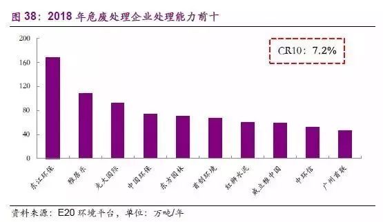 目前我國危廢市場的優(yōu)秀參與者眾多,隨著危廢處理“量價齊增”的情況延續(xù),從傳統(tǒng)危廢處理企業(yè)東江環(huán)保、光大綠色環(huán)保,到全產(chǎn)業(yè)鏈拓展的大型環(huán)保公司東方園林、北控水務(wù),再到資金實力雄厚的新興力量海螺創(chuàng)業(yè)、雅居樂,均在危廢行業(yè)持續(xù)開疆拓土。但是,我國的危廢市場行業(yè)集中度仍相對較低。根據(jù)E20環(huán)境平臺的統(tǒng)計,雖然我國的危廢企業(yè)處理量快速增長,但是CR10的總產(chǎn)能僅占全國總產(chǎn)能的7.2%,仍有大量的危廢產(chǎn)能被小型企業(yè)所瓜分。