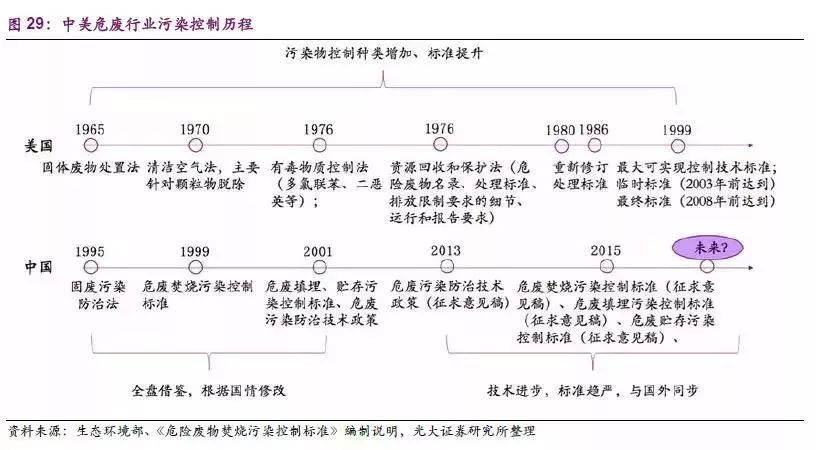 在中國對危廢污染進行控制的時期,美國相關(guān)產(chǎn)業(yè)已發(fā)展成熟。因此,中國在短短幾年內(nèi)先后推出危廢焚燒、填埋、貯存污染控制標(biāo)準(zhǔn),同時對危廢名錄和跨省轉(zhuǎn)移審批制度進行借鑒,建立起整套相對成熟的技術(shù)和標(biāo)準(zhǔn)體系。