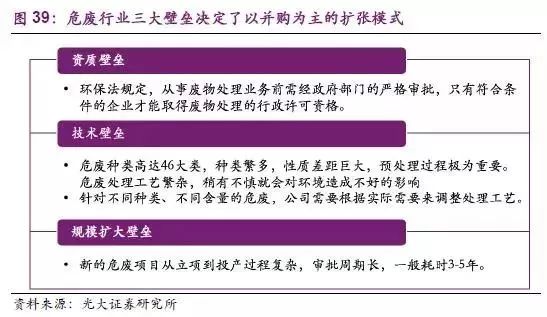 規(guī)模擴大壁壘:新的危廢項目從立項到投產(chǎn)過程復(fù)雜,審批周期長,一般耗時3-5年。顯然,收購有資質(zhì)的企業(yè)會比新建產(chǎn)能更容易擴大企業(yè)規(guī)模。