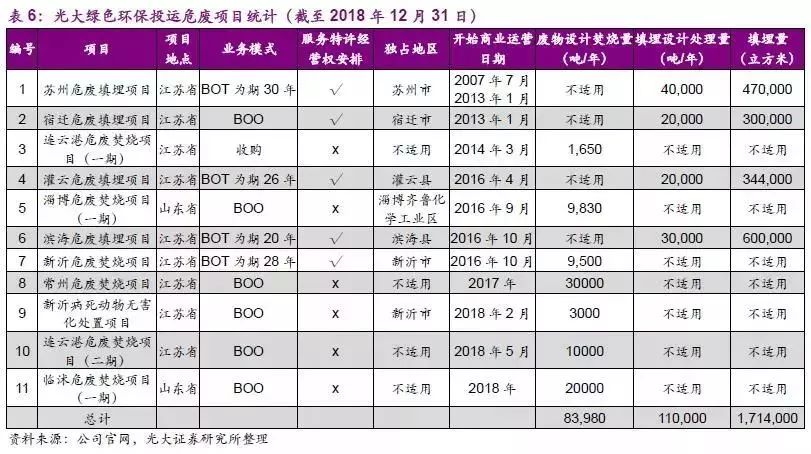 截止2018年12月31日,綠色環(huán)保共擁有58個生物質(zhì)綜合利用項目(運營22個、在建14個、籌建13個、未啟動二期項目9個)、32個危廢綜合處理項目(運營11個、在建4個、籌建17個)、7個光伏發(fā)電項目和2個風(fēng)電項目(均已投運)、以及9個環(huán)境修復(fù)項目(運營1個、在建7個、籌建1個),總投資共約240億元,年生活垃圾處理產(chǎn)能102萬噸,年危廢處理產(chǎn)能19.4萬噸(焚燒8.4、填埋11),年供熱量96萬噸。
