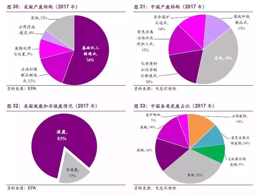 從產(chǎn)廢結(jié)構(gòu)上來看,美國是石油化工生產(chǎn)大國,其產(chǎn)廢結(jié)構(gòu)中基礎(chǔ)化工以及石油/煤制品制造業(yè)的產(chǎn)廢占比合計高達71%(2017年);由于石化企業(yè)多產(chǎn)生液態(tài)危廢,因而美國的危廢產(chǎn)量中83%為液態(tài)危廢。而我國的化工行業(yè)產(chǎn)廢僅占總量的19%,且產(chǎn)廢行業(yè)較為分散,有色金屬冶煉、非金屬礦采選、造紙等行業(yè)的產(chǎn)廢占比均超過10%。另一方面,液態(tài)危廢在國內(nèi)危廢總體結(jié)構(gòu)中占比較小,以目前的廢物結(jié)構(gòu)看,將廢堿(15.67%)、廢酸(14.37%)、廢油(5.36%)全看作液態(tài)危廢,合計占比僅為35%。