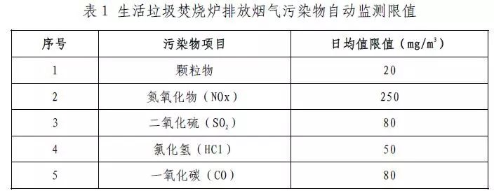 其中,生活垃圾焚燒爐排放煙氣污染物自動監(jiān)測限值是指,顆粒物日均值限值20毫克每立方米,氮氧化物(NOx) 250毫克每立方米,二氧化硫(SO2) 80毫克每立方米,氯化氫(HCl) 50毫克每立方米、一氧化碳(CO) 80毫克每立方米。