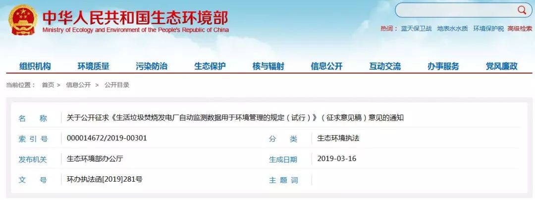 關(guān)于公開征求《生活垃圾焚燒發(fā)電廠自動監(jiān)測數(shù)據(jù)用于環(huán)境管理的規(guī)定(試行)》(征求意見稿)意見的通知