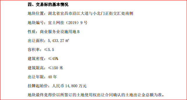 公告顯示,地塊范圍位于宜昌市西陵區(qū)沿江大道與小北門正街交匯處南側(cè),規(guī)劃總建設(shè)面積約3.5萬平方米,出讓年限為40年,掛牌起始價(jià)為1.48億元。桑德置業(yè)本次參與競(jìng)拍國(guó)有土地使用權(quán),是為滿足未來業(yè)務(wù)發(fā)展對(duì)辦公場(chǎng)所的需要。