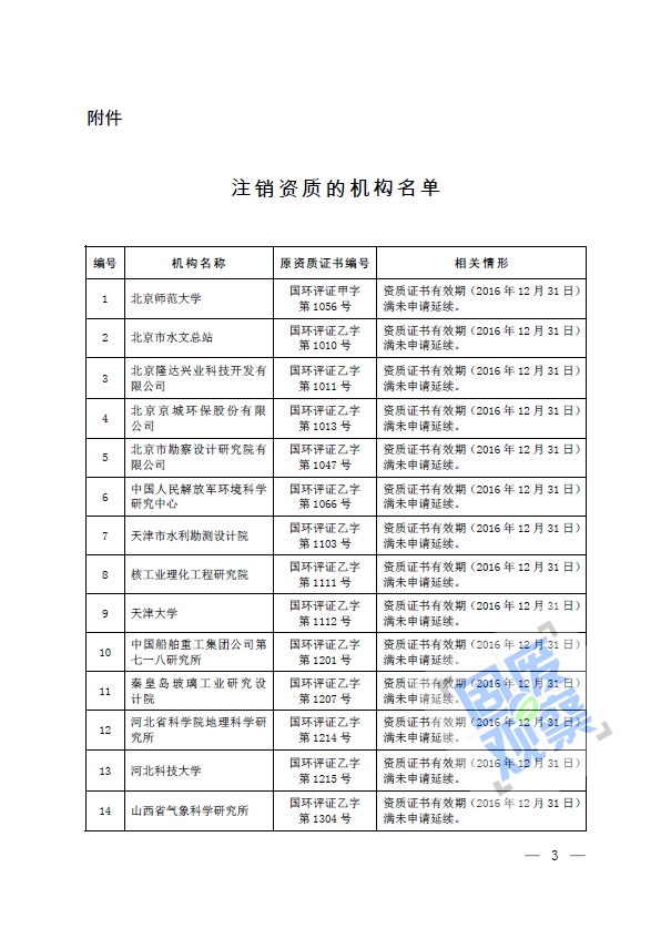 根據(jù)《建設(shè)項目環(huán)境影響評價資質(zhì)管理辦法》(環(huán)境保護部令第36號)的有關(guān)規(guī)定,我部對建設(shè)項目環(huán)境影響評價資質(zhì)(以下簡稱資質(zhì))證書有效期滿未申請延續(xù)的69家機構(gòu)資質(zhì)予以注銷(具體名單詳見附件)。