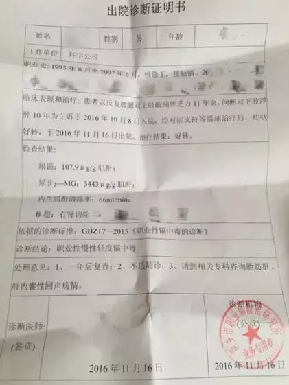 圖為一名環(huán)宇公司工人的出院診斷書(shū),顯示為職業(yè)性慢性輕度鎘中毒
