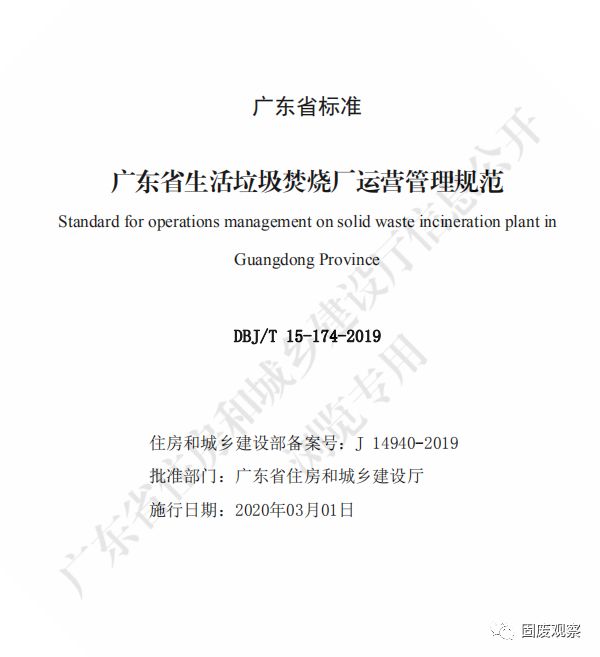 廣東省住房和城鄉(xiāng)建設(shè)廳關(guān)于發(fā)布廣東省標(biāo)準(zhǔn)《廣東 省生活垃圾焚燒廠運營管理規(guī)范》的公告 粵建公告〔2019〕82 號 經(jīng)組織專家委員會審查,現(xiàn)批準(zhǔn)《廣東省生活垃圾焚燒廠運營管理 規(guī)范》為廣東省地方標(biāo)準(zhǔn),編號為 DBJ/T 15-174-2019。