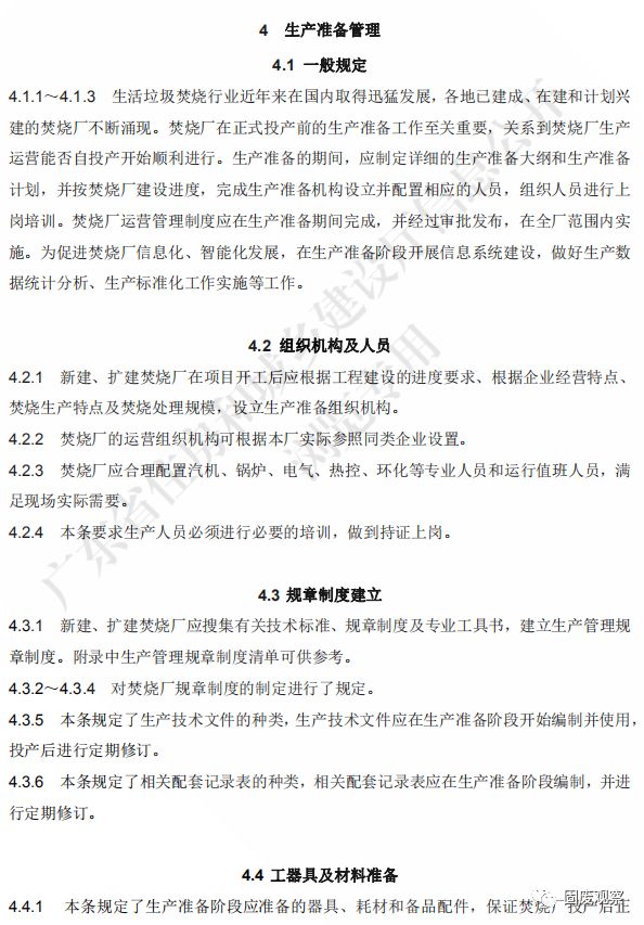 4.1.2 焚燒廠生產(chǎn)準(zhǔn)備的內(nèi)容應(yīng)包括但不限于:生產(chǎn)準(zhǔn)備組織機構(gòu)設(shè)立、生產(chǎn)準(zhǔn)備人員 配置、生產(chǎn)準(zhǔn)備人員培訓(xùn)、規(guī)章制度的建立、工器具及材料準(zhǔn)備、生產(chǎn)運營準(zhǔn)備及信息系 統(tǒng)建設(shè)等。
