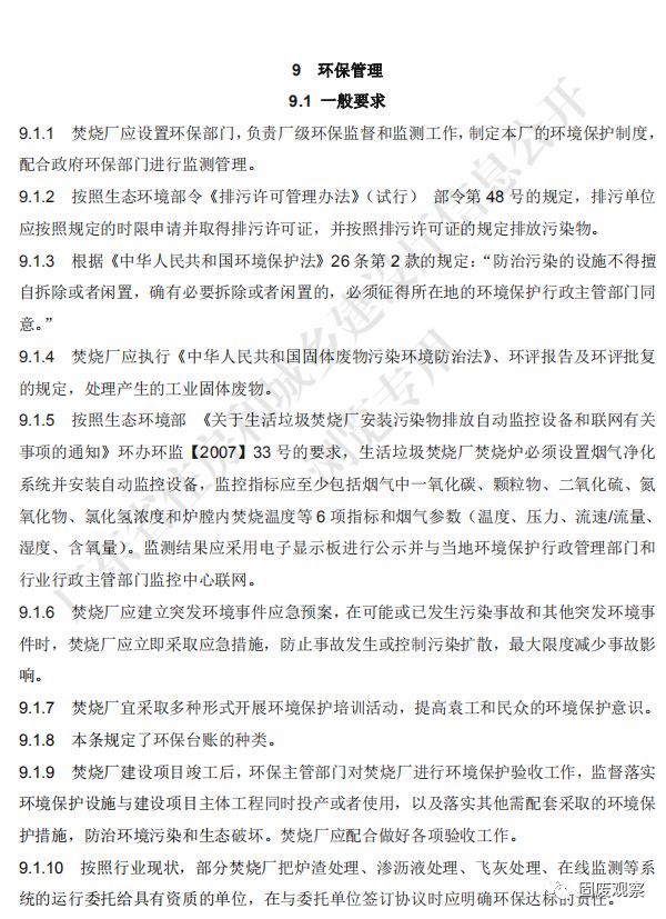 9.1.1 焚燒廠應(yīng)按有關(guān)規(guī)定建立環(huán)境保護責(zé)任制度,明確單位負(fù)責(zé)人和相關(guān)人員的責(zé)任, 配置專職環(huán)保管理人員。