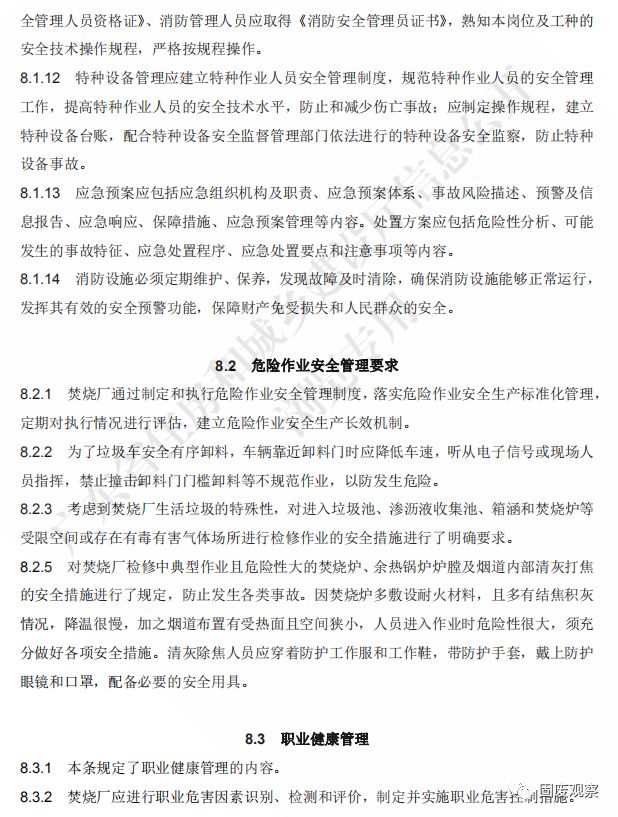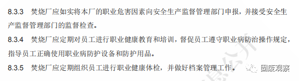 8.3.1 焚燒廠職業(yè)健康管理應(yīng)包括:職業(yè)病危害因素檢測、職業(yè)病危害申報、職業(yè)衛(wèi)生 培訓(xùn)、職業(yè)健康檢查等。