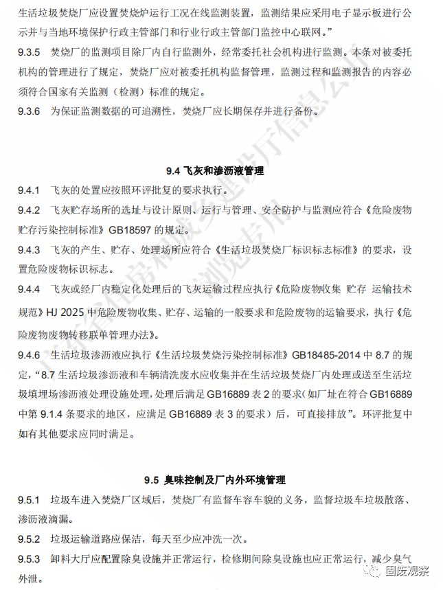 9.1.11 對焚燒廠內(nèi)產(chǎn)生的固體廢棄物的處理處置應(yīng)符合國家現(xiàn)行標(biāo)準(zhǔn)《固體廢物處理處 置工程技術(shù)導(dǎo)則》HJ2035 的有關(guān)規(guī)定。