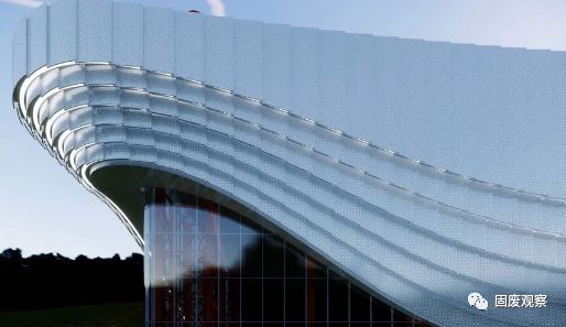 建筑形式所反映的內(nèi)核,是對(duì)清潔能源轉(zhuǎn)換的開(kāi)放性以及對(duì)機(jī)械與工業(yè)美學(xué)的自信。建筑起翹的一角,透出垃圾焚燒電廠內(nèi)部的紅色構(gòu)件,體現(xiàn)了一種開(kāi)放的態(tài)度,把內(nèi)部的焚燒發(fā)電流程如同盛裝揭幕一般展示出來(lái),體現(xiàn)出工業(yè)建筑對(duì)清潔能源處理的自信。