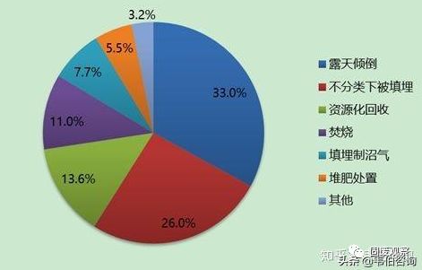 根據(jù)世界銀行報(bào)告,2016年,全球垃圾的末端處置方式有露天傾倒、填埋(不分類、沼氣化、控制)、焚燒、堆肥、資源化回收。有33%的垃圾未加處理被露天傾倒,26%的垃圾不分類下被填埋掉,7.7%的垃圾填埋制沼氣,11%的垃圾被焚燒,5.5%垃圾堆肥處置,13.6%垃圾進(jìn)行了資源化回收。