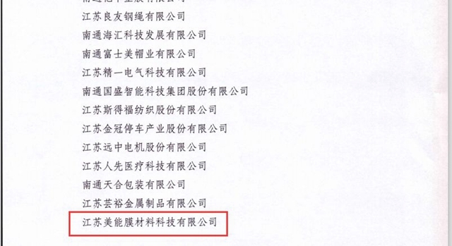 《名單》顯示,中信環(huán)境技術旗下美能膜重要生產基地——江蘇美能膜材料科技有限公司榮登榜單。