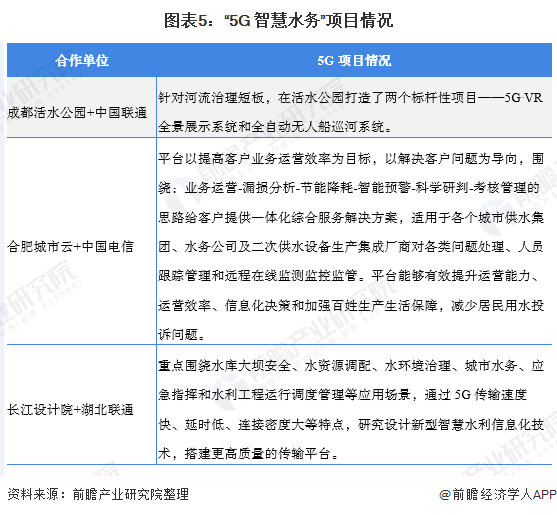 此外,各地水務(wù)集團(tuán)在加快“5G+智慧水務(wù)”項(xiàng)目的落地和進(jìn)程。例如,2019年7月,四川首個(gè)5G“智慧水務(wù)”項(xiàng)目亮相,項(xiàng)目中的5G VR全景展示系統(tǒng)和全自動(dòng)無人船巡河系統(tǒng)引人矚目。
