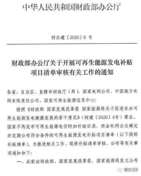 3月16日,財政部辦公廳印發(fā)《關(guān)于開展可再生能源發(fā)電補貼項目清單有關(guān)工作的通知》(財辦建〔2020〕6號),明確可再生能源項目進入首批財政補貼目錄的條件。