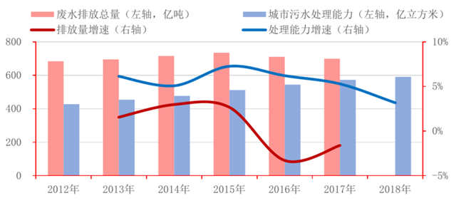 圖5:廢水總排放量與城市污水處理能力(按365天滿(mǎn)功率計(jì))趨勢(shì)比較