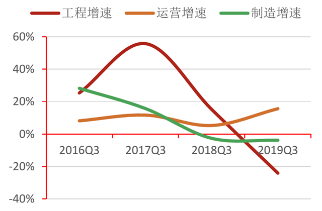 從盈利能力來(lái)看,行業(yè)營(yíng)業(yè)總收入、凈利潤(rùn)增速呈下降趨勢(shì)。其中,營(yíng)業(yè)收入自2015年以來(lái)增速最高達(dá)34.37%,2019年第三季度行業(yè)同比下降9.28%,工程、制造類(lèi)企業(yè)同比下降24.03%、3.75%;凈利潤(rùn)絕對(duì)值在2017年達(dá)到152.17億后, 2018年縮減至66.64億。