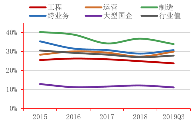 3)杠桿率逐年上升。2016年后行業(yè)杠桿率逐年上升且不斷逼近國(guó)務(wù)院針對(duì)一般工業(yè)企業(yè)杠桿率的指導(dǎo)意見(jiàn)值70%(工程類(lèi)非工業(yè)企業(yè)為75%),其中工程類(lèi)企業(yè)杠桿率明顯高于其他類(lèi)企業(yè),2019年第三季度達(dá)65.40%。