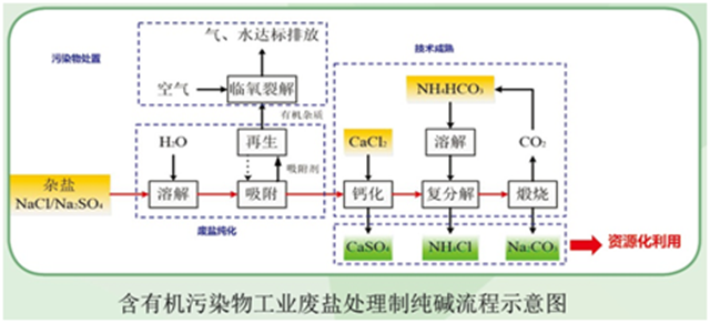利用吸附-脫附技術(shù)富集工業(yè)廢鹽溶液中的有機污染物,再通過臨氧裂解技術(shù)實現(xiàn)達標排放,凈化后的鹽溶液進入制堿工藝,制堿工藝技術(shù)成熟,從而實現(xiàn)工業(yè)廢鹽的資源化利用。