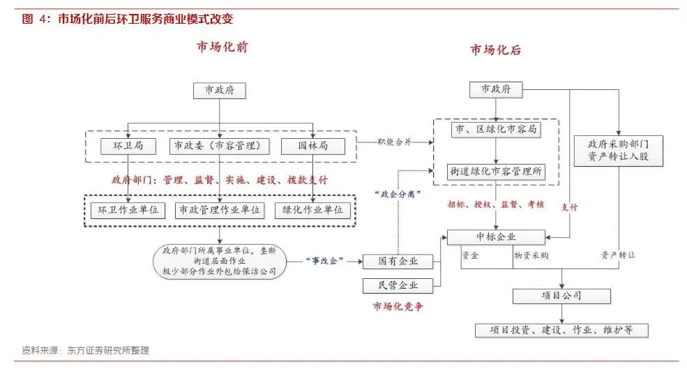 傳統(tǒng)環(huán)衛(wèi)作為一項公共事業(yè),一直由政府部門和下屬事業(yè)單位承擔著所有的管理、規(guī)劃、實施、監(jiān)督的工作,為政府壟斷產(chǎn)業(yè)。最初與外部市場主體的合作僅限于設(shè)備采購和施工采購,運營管理責任由政府企事業(yè)單位承擔。長久下來,國有體制給環(huán)衛(wèi)服務(wù)行業(yè)的發(fā)展帶來了諸多問題:“政企不分”、“管干合一”導致企業(yè)運營效率低和缺乏競爭、無法滿足快速城鎮(zhèn)化帶來的工作量增長,最終體現(xiàn)在環(huán)衛(wèi)服務(wù)質(zhì)量差,這就要求行業(yè)加速推進市場化。