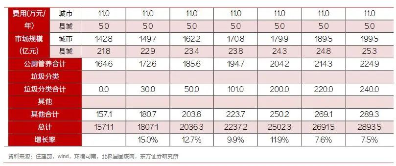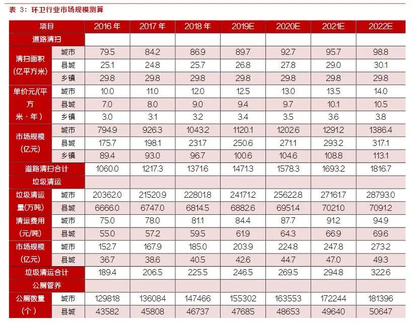 垃圾清運層面,根據(jù)住建部統(tǒng)計,2018年城市垃圾清運量為2.28億噸,按目前市場情況,假設(shè)垃圾轉(zhuǎn)運費用城市為80元/噸,縣城為60元/噸,假設(shè)增長率與道路清掃相同均為4%,目前總規(guī)模在240億元左右。公廁管養(yǎng)方面,假設(shè)城市與縣城公廁數(shù)量的增長維持過去三年的平均增長率,管養(yǎng)費用城市為11萬元/年,縣城為5萬元/年,則公廁管養(yǎng)費用合計190億元左右。