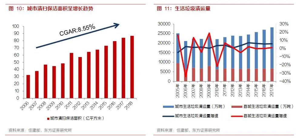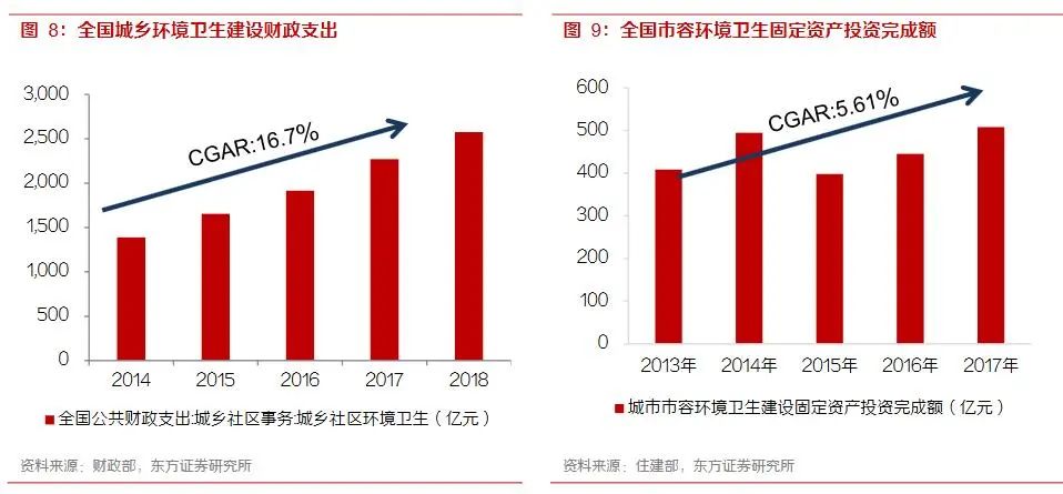 環(huán)衛(wèi)行業(yè)的收入來自于地方政府的環(huán)境衛(wèi)生建設(shè)的財政支出,2018年城鄉(xiāng)環(huán)境衛(wèi)生建設(shè)的財政支出達到2500億元,且過去三年保持16.7%左右的復合增速。城鎮(zhèn)化進程的深入,城市邊界的的延伸,城市垃圾清運和道路清掃的工作量會持續(xù)增長,環(huán)保要求的提高則推動了處理單價上漲,行業(yè)正在經(jīng)歷量和價值雙重提升的局面。