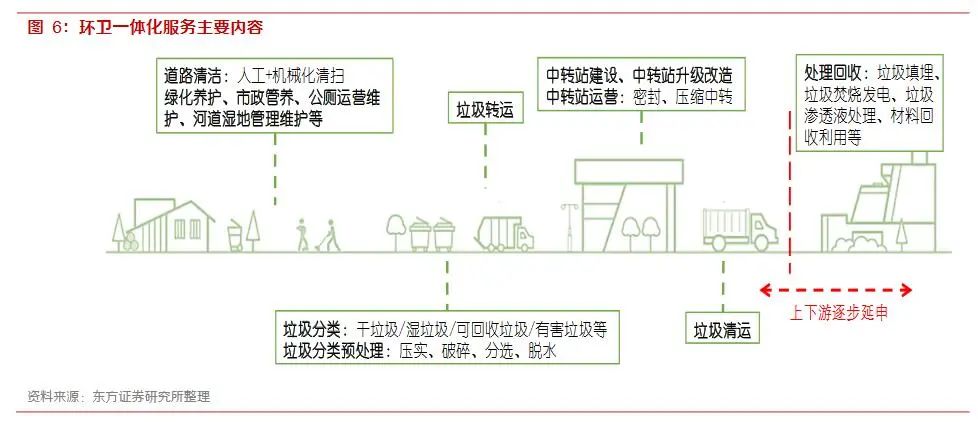 環(huán)衛(wèi)業(yè)務(wù)環(huán)節(jié)的一體化指的是服務(wù)內(nèi)容的增加以及產(chǎn)業(yè)上下游鏈條的多維度整合。具體來說,即環(huán)衛(wèi)項目突破傳統(tǒng)意義上的清掃保潔、垃圾清運,將清掃、保潔、中轉(zhuǎn)、收運、處理進行一體化打包,同時涉及垃圾分類、餐廚垃圾收運處理、綠化養(yǎng)護、市政管養(yǎng)等內(nèi)容,隨著未來人們對生活環(huán)境要求的不斷提高,將會不斷納入新的服務(wù)項目。