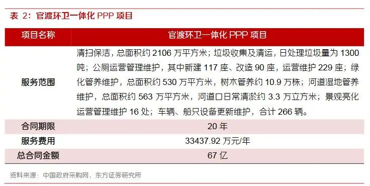 我們分別選取北京環(huán)境中標的赤峰市環(huán)衛(wèi)一體化項目、龍馬環(huán)衛(wèi)中標的水城縣環(huán)衛(wèi)一體化項目以及僑銀環(huán)保中標的云南昆明官渡環(huán)衛(wèi)一體化項目三個具有代表性的環(huán)衛(wèi)一體化項目,測算其中除前述環(huán)衛(wèi)項目外其他項目所占比例。根據(jù)各項目合同中列示的作業(yè)項目工作量及單價計算可得前述項目金額,總服務(wù)費減去前述項目服務(wù)費得到其他項目金額??紤]云南昆明官渡環(huán)衛(wèi)一體化項目總金額達67億元,體量較大所以包含服務(wù)范圍相對更廣,故假設(shè)市場化合同中其他項目所占比例略低于平均值即15%左右。