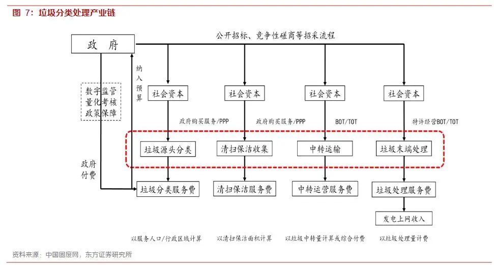 2016年到2019年,垃圾分類的工作重點以前端為主,重心放在發(fā)動群眾、宣教督導、分類設(shè)施配置與運維等。進入2019年以來,地級城市全面啟動垃圾分類,垃圾分類第三方服務(wù)已經(jīng)成為環(huán)衛(wèi)服務(wù)及環(huán)衛(wèi)一體化服務(wù)的標配內(nèi)容。隨著地方立法的逐步完成,在繼續(xù)推進前端任務(wù)的同時,垃圾分類全流程監(jiān)管平臺建設(shè)、垃圾分揀中心建設(shè)及運營、垃圾分類第三方考核與監(jiān)管、垃圾分類與再生資源業(yè)務(wù)協(xié)同等工作將得到全面推動。未來隨著更多垃圾分類業(yè)務(wù)納入環(huán)衛(wèi)一體化當中,將帶來更大的市場增量。