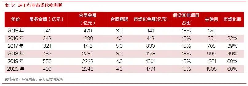(2)環(huán)衛(wèi)市場化率約為60%,仍有較大的發(fā)展空間根據(jù)當年新簽首年服務(wù)費用與之前未到期合同年均服務(wù)金額相加得到當年的市場化規(guī)模,市場化初期以政府購買為主,合同年限一般在3年左右,2017年開始PPP模式大規(guī)模發(fā)展,但政府購買仍為主要模式,因此假設(shè)2017年之前合同平均期限逐年增加至5年。用所得市場化金額與前述市場總規(guī)模相比可得到當年環(huán)衛(wèi)市場化的比例。由于前述市場規(guī)模測算僅包含環(huán)衛(wèi)服務(wù)中道路清掃、垃圾清運、公廁管養(yǎng)、垃圾分類等項目,而當前市場化項目中通常打包一定比例的其他項目,如:河道濕地管養(yǎng)維護、新建或改造公廁、中轉(zhuǎn)站改造建設(shè)與運營等,因此對于市場化測算,需要在現(xiàn)有合同金額數(shù)據(jù)上進行一定程度的修正。即市場化金額除去其中包含的其他項目金額。