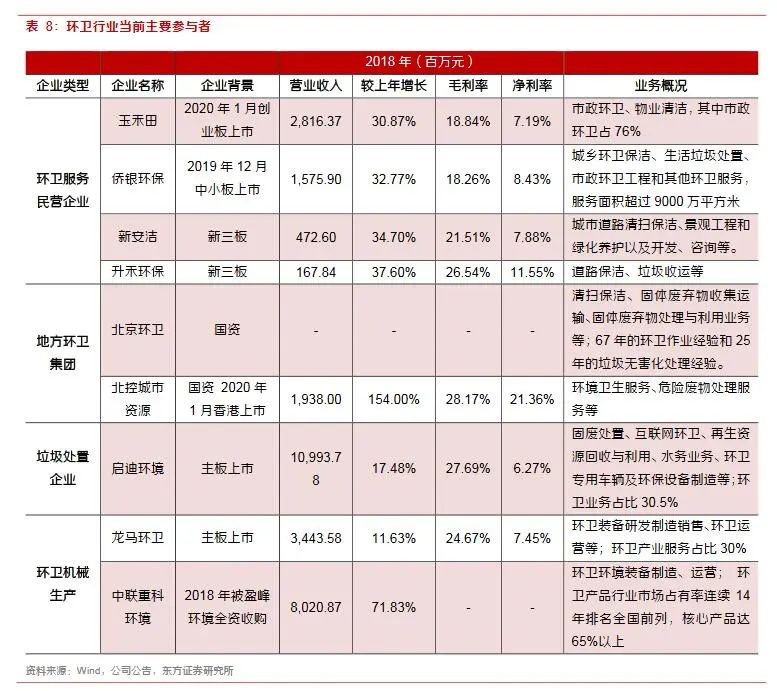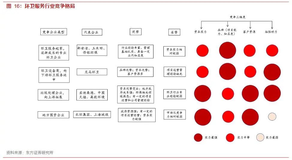 3)垃圾處理公司,向上游拓展,典型如啟迪桑德、中國天楹,政府關(guān)系、大項目管理能力、資本實力、異地擴張能力層面均非常強,在品牌影響力和環(huán)衛(wèi)項目經(jīng)驗上有欠缺;