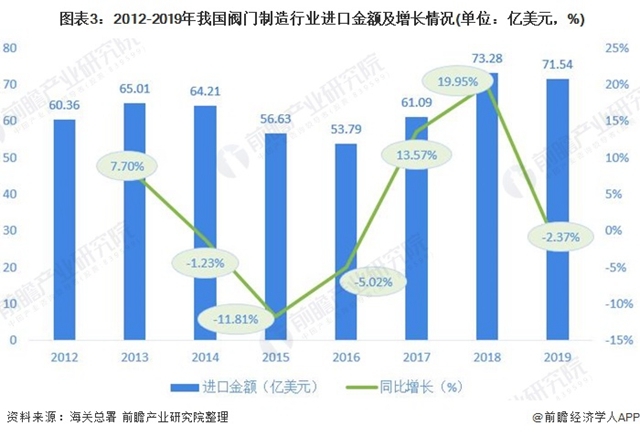 海關(guān)數(shù)據(jù)顯示,2012-2019年,我國閥門行業(yè)進口量總體呈波動上升趨勢。2018-2019年這兩年由于受到與美國的貿(mào)易摩擦影響,行業(yè)進口量和增速均下滑,2019年行業(yè)進口量為102355萬套,同比下滑1.58%。