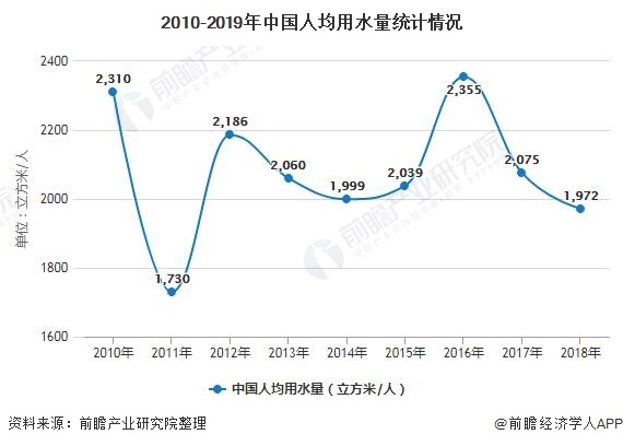 我國水資源長期面臨水資源分布不均、人均占有量少、水資源利用率低的問題。數(shù)據(jù)顯示,2010-2019年,我國用水量大約維持在6000億立方米左右,近兩年的用水總量雖然負(fù)增長,但總量依然較大。同時(shí),2010-2018年,我國人均水資源量呈波動(dòng)下降趨勢,2018年,中國人均用水量下降至1972立方米/人。