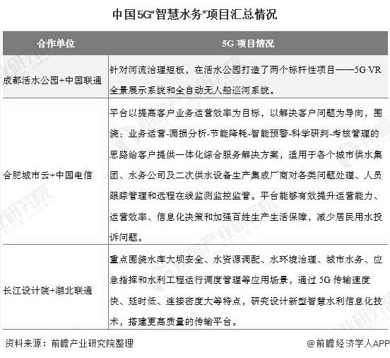 此外,各地水務(wù)集團(tuán)在加快“5G+智慧水務(wù)”項(xiàng)目的落地和進(jìn)程。例如,2019年7月,四川首個(gè)5G“智慧水務(wù)”項(xiàng)目亮相,項(xiàng)目中的5G VR全景展示系統(tǒng)和全自動(dòng)無人船巡河系統(tǒng)引人矚目。
