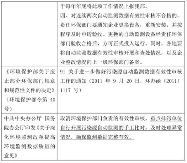 該辦法廢止后,根據(jù) 2017 年 9 月發(fā)布的《關于深化環(huán)境監(jiān)測改革提高環(huán)境監(jiān)測數(shù)據(jù)質量的意見》的相關規(guī)定(見上表),在實踐中比對監(jiān)測的主體由環(huán)保部門變更為重點排污單位自身,確保監(jiān)測數(shù)據(jù)完整有效的職責與義務也相應轉移至重點排污單位,污水處理廠應自行負責自動監(jiān)測設備的維護和比對,保障在線監(jiān)測數(shù)據(jù)的完整和有效。