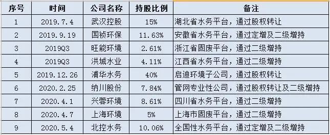2019年以來,三峽集團通過直接或者間接的方式參股了9家環(huán)保行業(yè)上市公司,其中 6家水務(wù)企業(yè),2家固廢業(yè)務(wù),1家管網(wǎng)企業(yè),未來還將圍繞長江治理的需求參股更多上市公司。