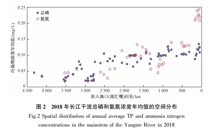 由圖 2可見(jiàn),長(zhǎng)江干流氨氮濃度沿程上升,長(zhǎng)江口氨氮濃度最高,長(zhǎng)江上游尾段、長(zhǎng)江中游上半段和長(zhǎng)江下游氨氮濃度相對(duì)較高,金沙江以及宜賓以下長(zhǎng)江上游上半段、中游下半段(洞庭湖和鄱陽(yáng)湖之間)的氨氮濃度相對(duì)較低。長(zhǎng)江下游氨氮濃度總體高于上游和中游,與長(zhǎng)三角地區(qū)經(jīng)濟(jì)發(fā)展水平較高以及氨氮來(lái)源主要以點(diǎn)源為主有關(guān)。